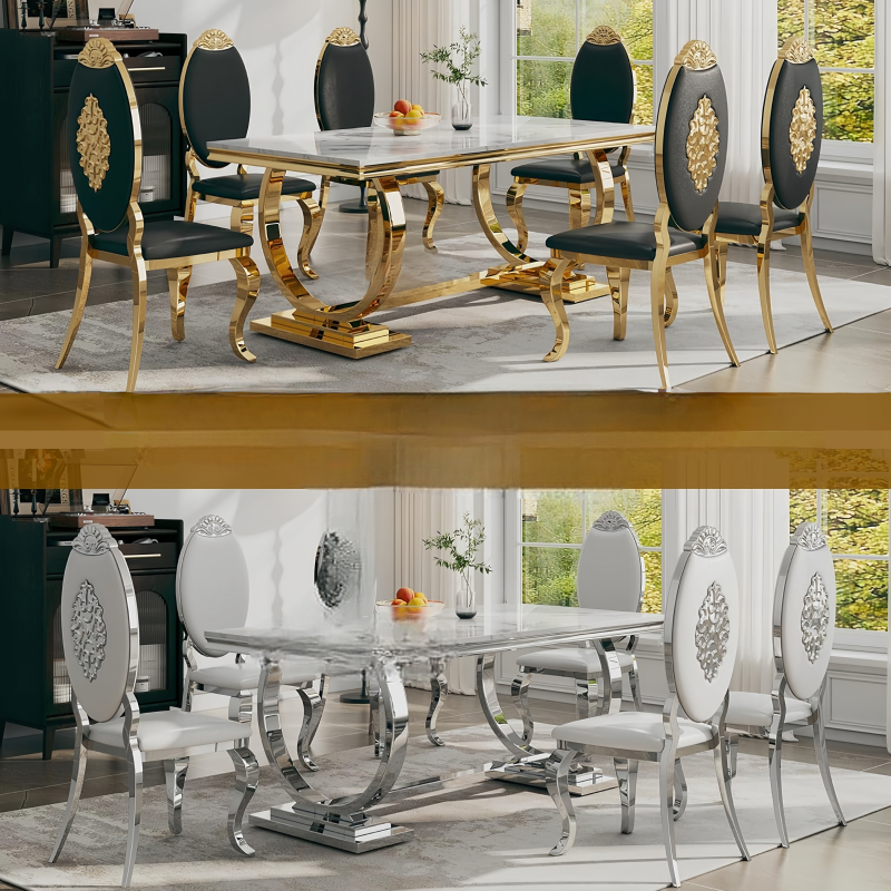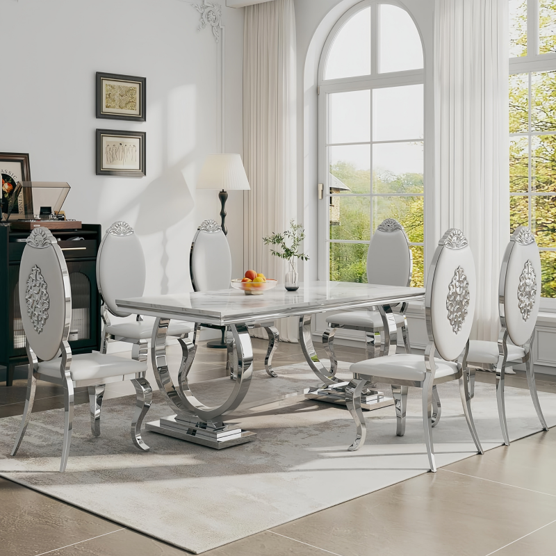 Ensemble de table à manger en acier inoxydable argenté pour 6 personnes, table à manger moderne avec plateau en marbre blanc et chaises argentées, utilisation à domicile ou à l'hôtel
