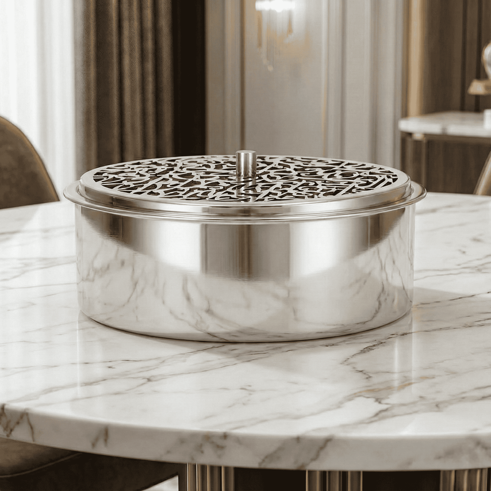 Type de couvercle:Couvercle plat orné de motifs arabes ajourés et doté d'une poignée centrale.