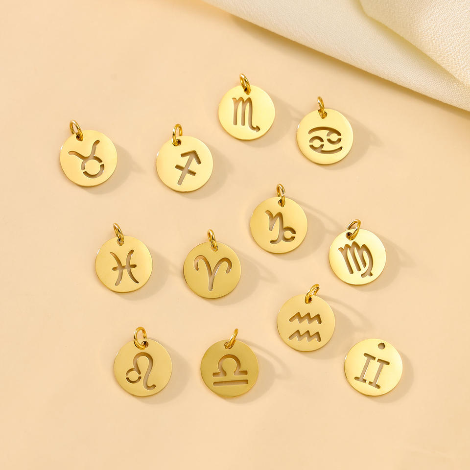 Simple 18K PVD or signe du zodiaque en acier inoxydable pendentif à breloque trou supérieur 12mm plat rond Constellations pendentif pour la fabrication de bijoux