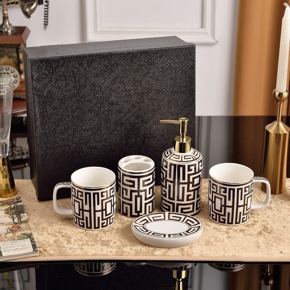 Ensemble de salle de bain marocain simple et durable en cinq pièces : distributeur de savon, gobelet à bain de bouche, porte-savon, porte-brosse à dents en céramique