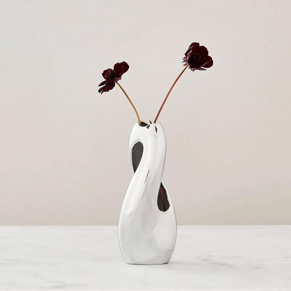 Vase décoratif en métal argenté incurvé simple, parfait pour l'aménagement intérieur et l'amélioration des pièces, fabriqué à la main en Inde