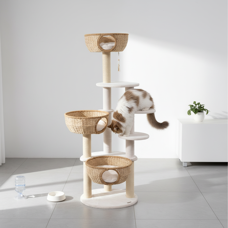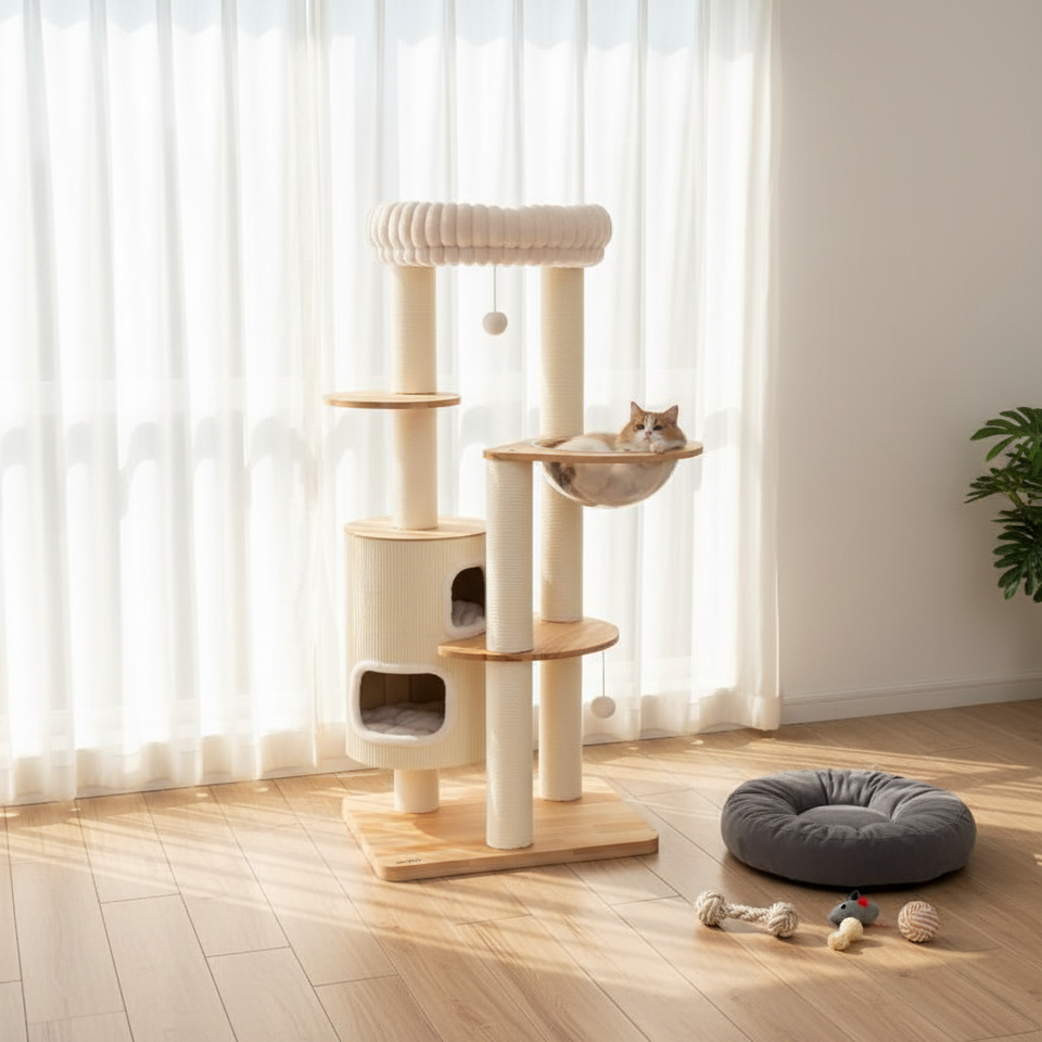 Condo pour chat multi-niveaux au design simple, style scandinave, avec matériaux en bois et lin, respectueux de l'environnement