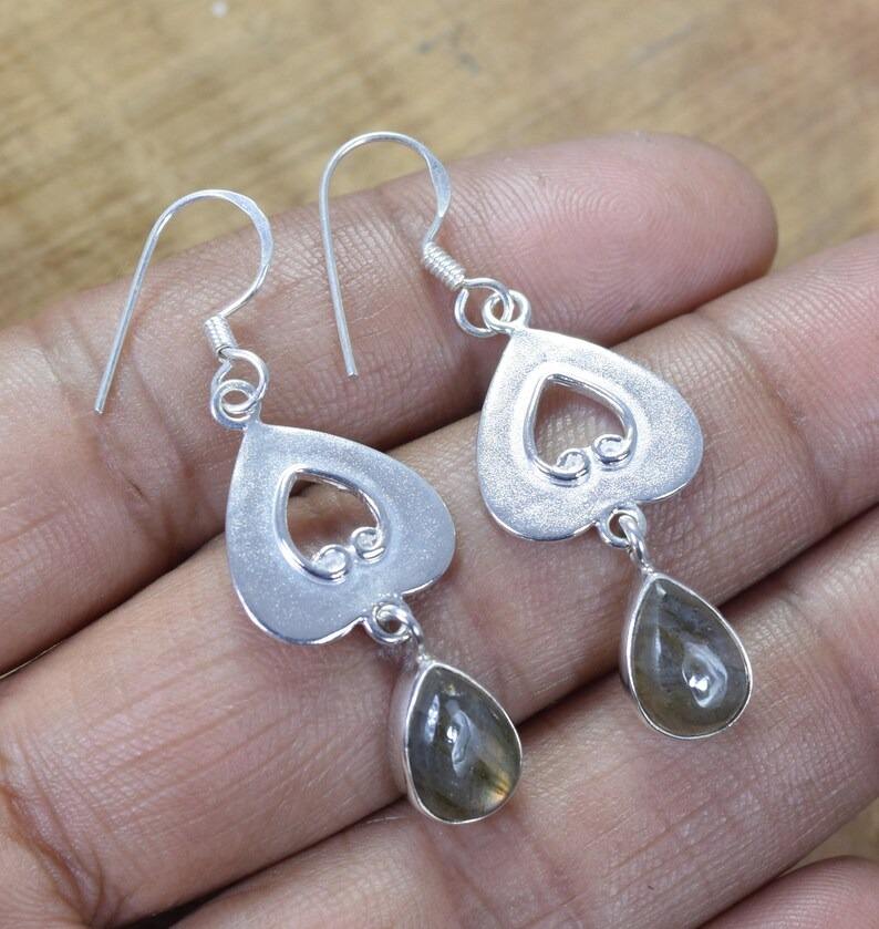 Boucles d'oreilles à l'aspect simple Boucles d'oreilles pendantes de style bohème Bijoux en argent Labradorite Gemstone 925 Boucles d'oreilles en argent sterling massif pour femmes