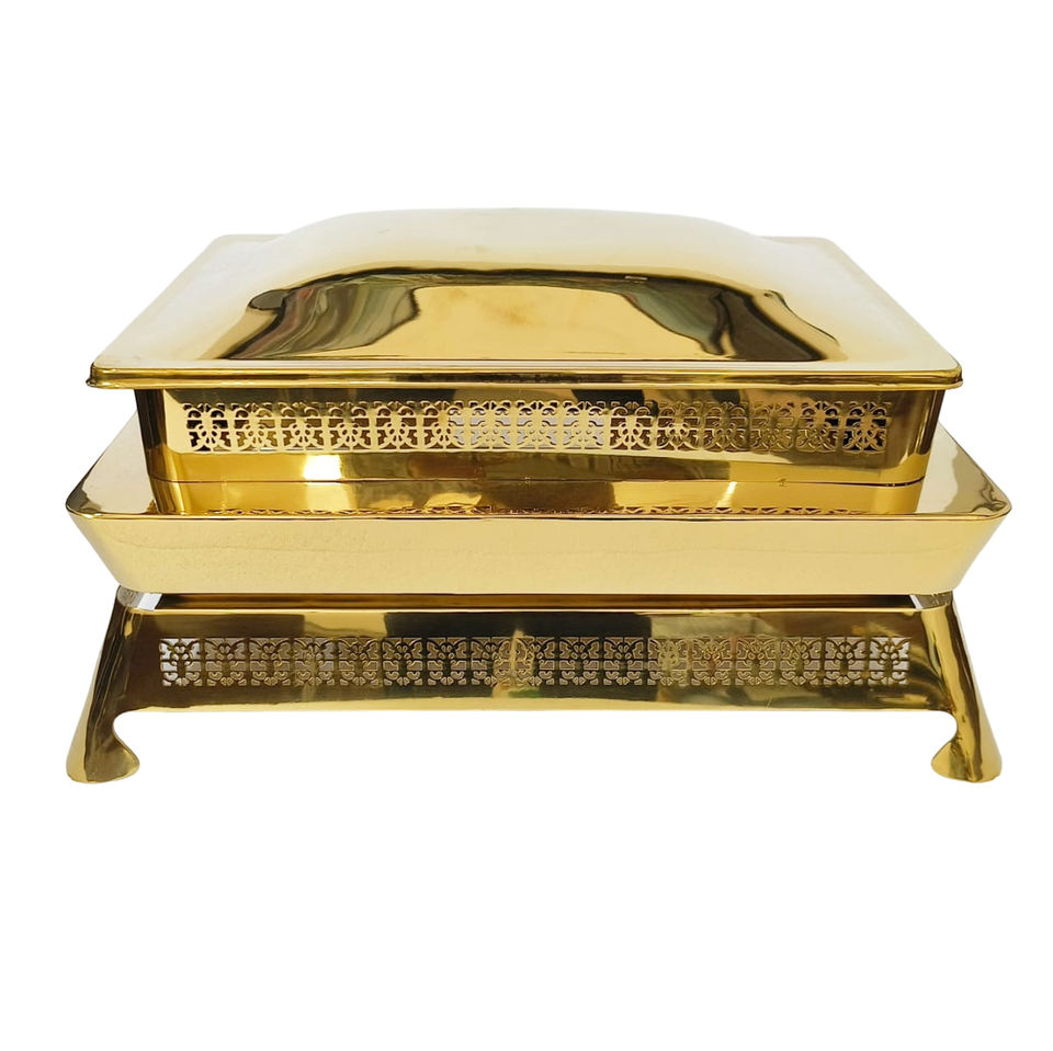 Nouveau modèle de plat de service chauffant arrondi en acier inoxydable avec finition dorée brillante, avec couvercle et base sur pieds, en vente