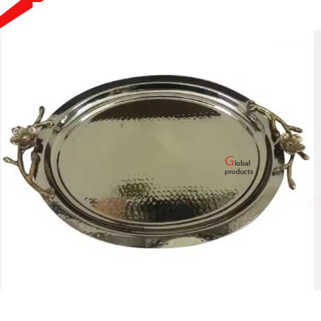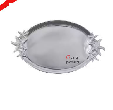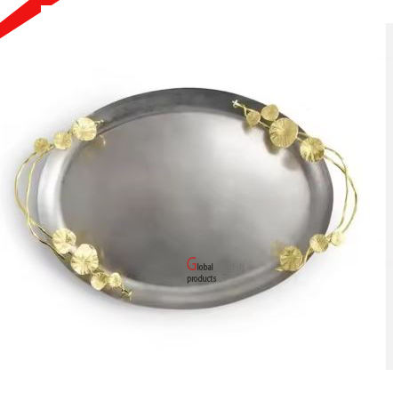 Plateau de service en métal fini argenté à aspect simple avec poignée en forme de fleur pour hôtel, maison et restaurant