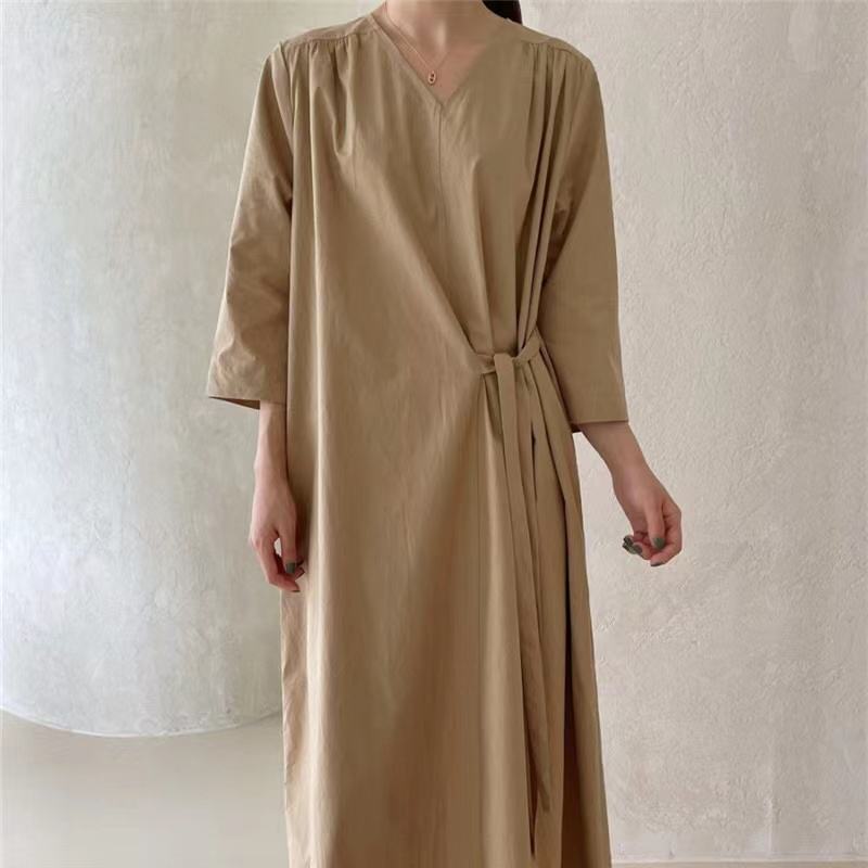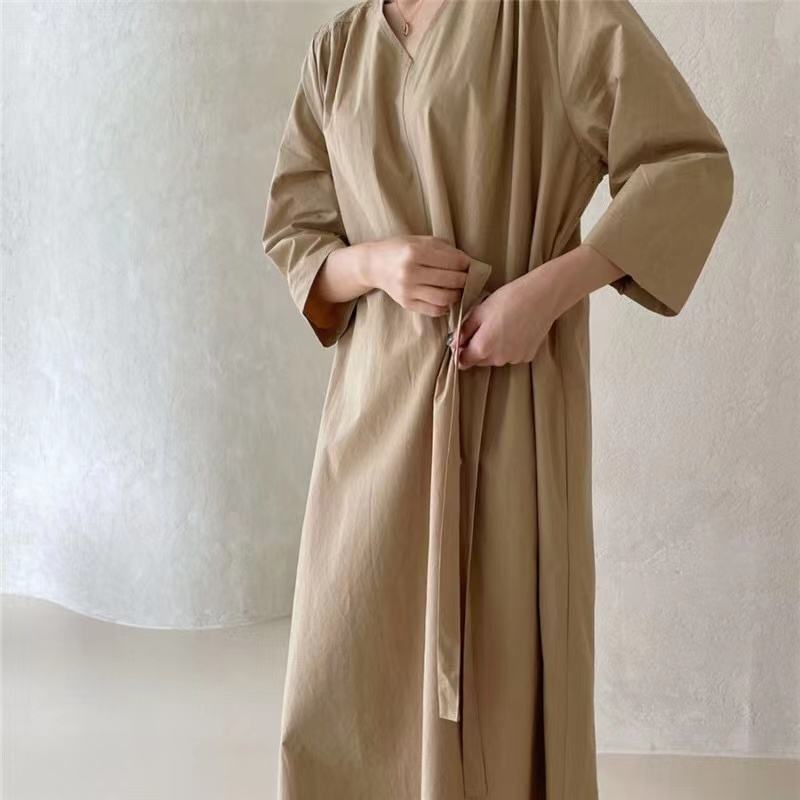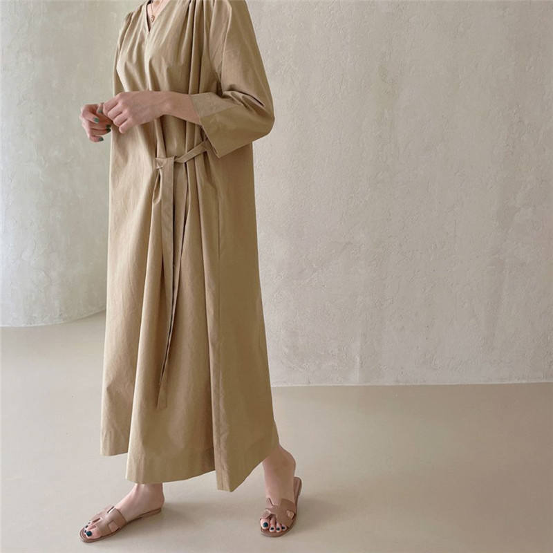 Robe simple, ample, cintrée, à manches trois-quarts, avec lacets, poches des deux côtés et ceinture