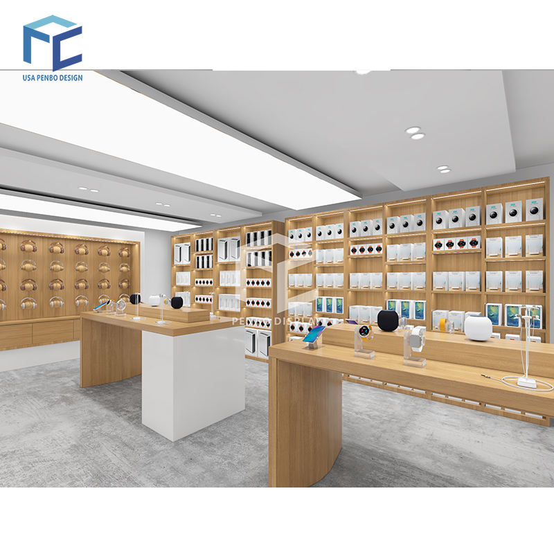 Vitrine murale de style bois pour magasin de téléphonie mobile, mobilier de magasin de marque électronique informatique, design simple pour boutique de téléphonie mobile