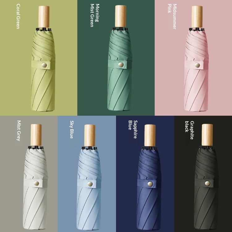 Simple Plain Color Three-fold Wooden Handle Girl's Fresh Black Anti-sunshade Sunny Rain Umbrella Printed Logo