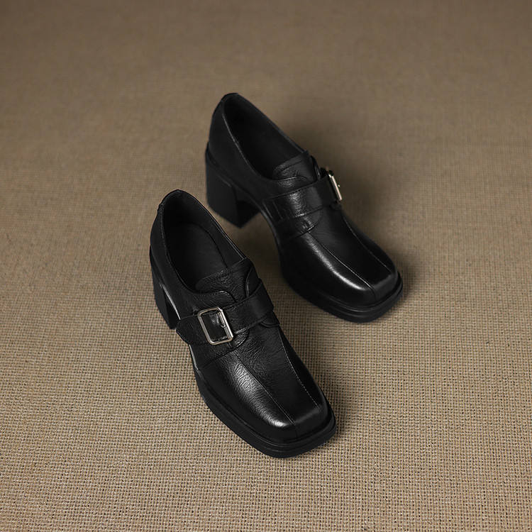 Chaussure simple à bout carré en cuir véritable imperméable, avec boucle, style rétro, couleur unie, semelle souple et design découpé profond