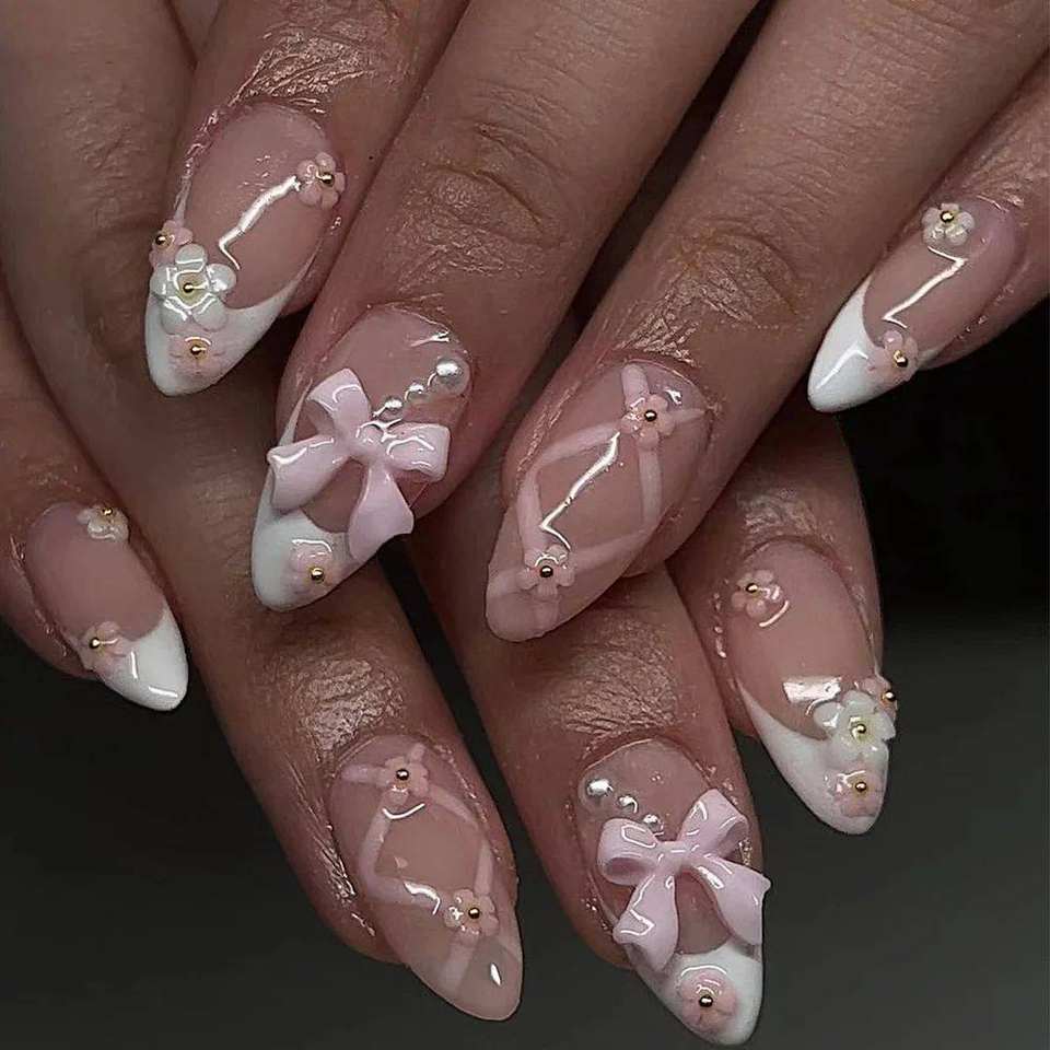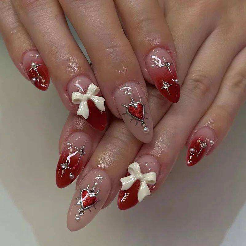 Faux ongles simples en forme de stiletto français pour les doigts, Saint-Valentin, amande, moyen, M