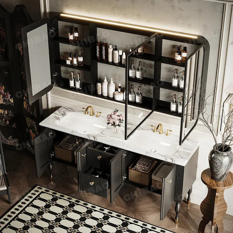 Style simple en bois massif pour meubles de salle de bain avec évier portes coulissantes miroir mural pour usage domestique