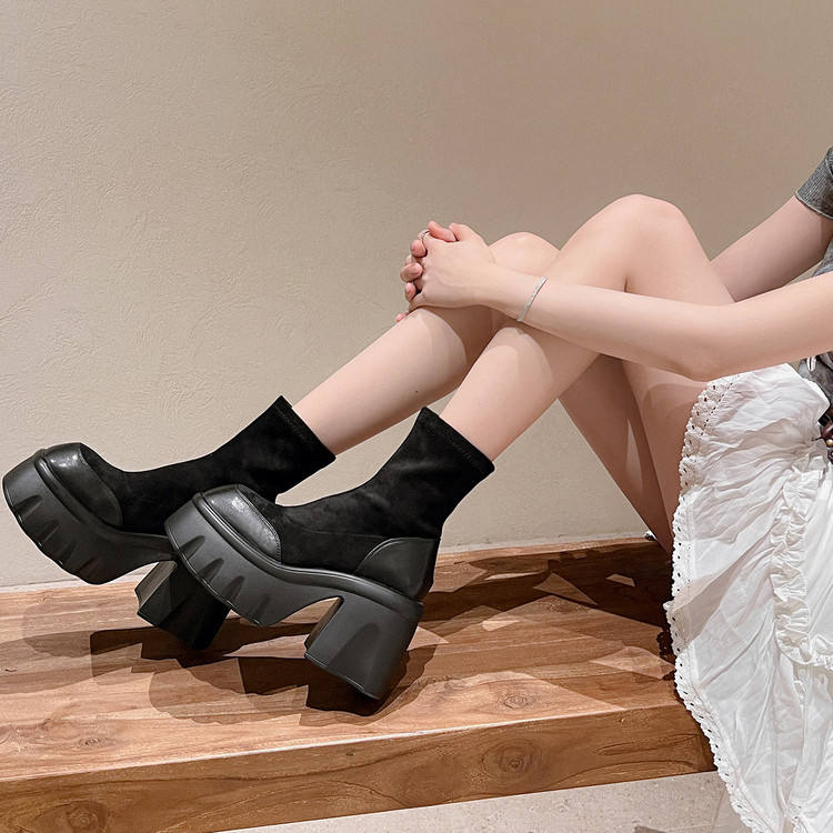 Bottines plates à talons hauts imperméables simples et polyvalentes avec un haut court, dotées d'une pointe ronde et d'une fermeture éclair au dos