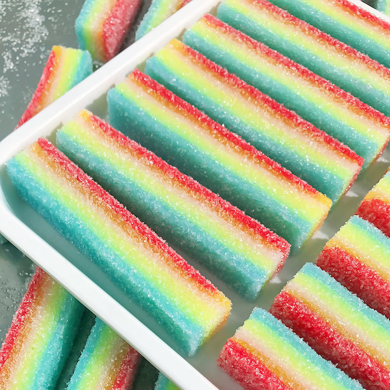 Jouet Squishy Taba en plastique ultra-doux, imitation bonbons moelleux, à presser, avec sable acide et bandes longues arc-en-ciel, anti-stress