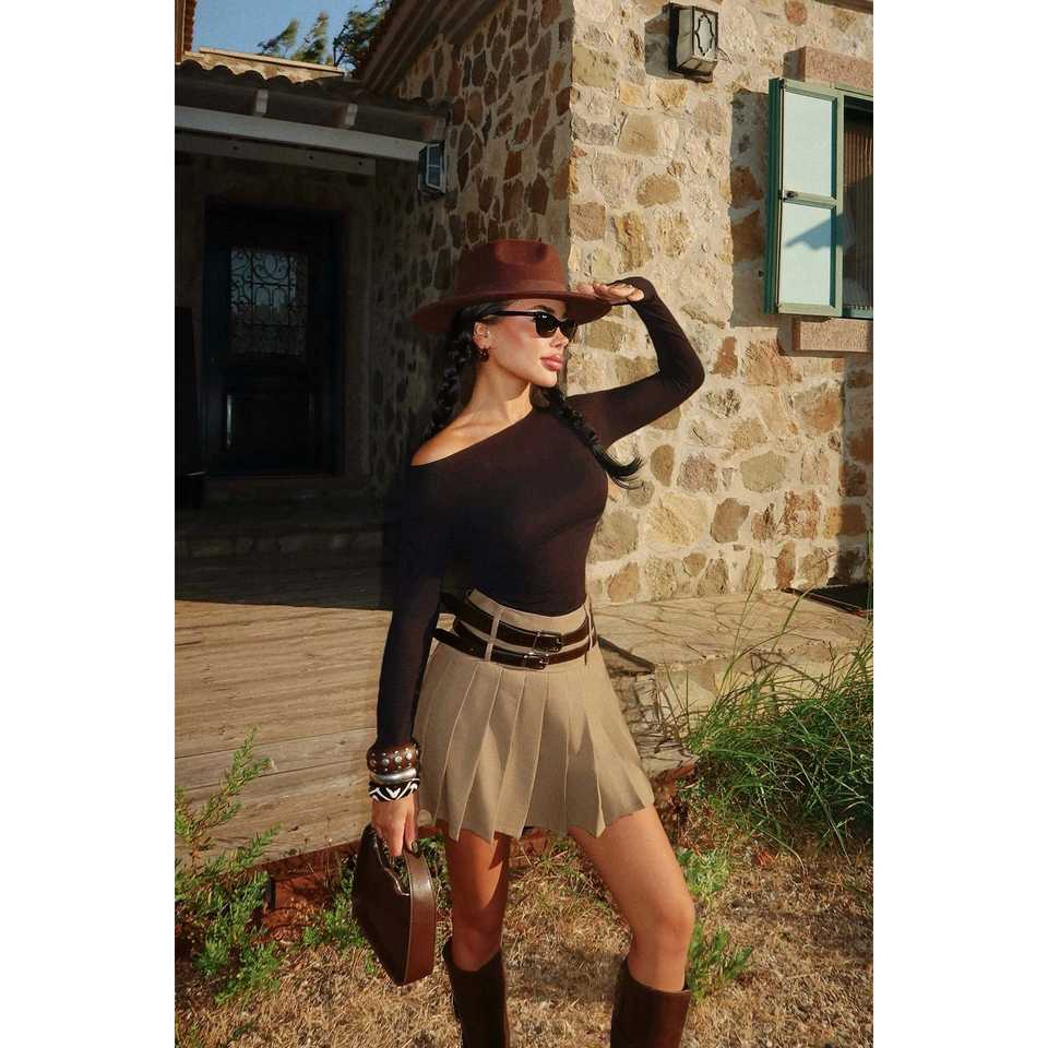 Mini-jupe Sinatra beige à double ceinture en tissu tricoté de laine d'été avec imprimé brodé, taille empire et taille naturelle, logo sur la ceinture
