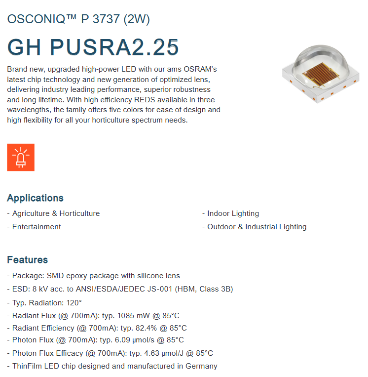 PUSRA2.25-T4U1-1-1 GH couleur unique Hyper Rouge 635-666nm 1.3W 3737SMD Osrams Puce LED haute puissance Dimmable CRI 70/80/90