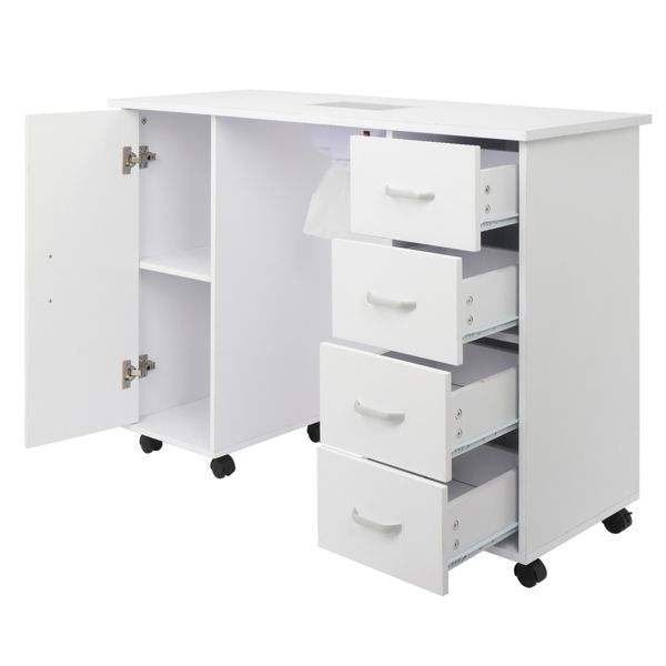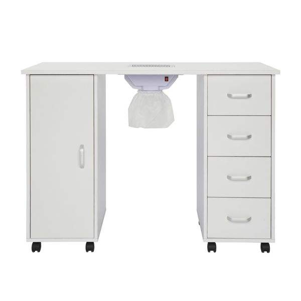 Table à ongles en MDF à une porte avec 4 tiroirs, finition blanche et accessoire de ventilateur