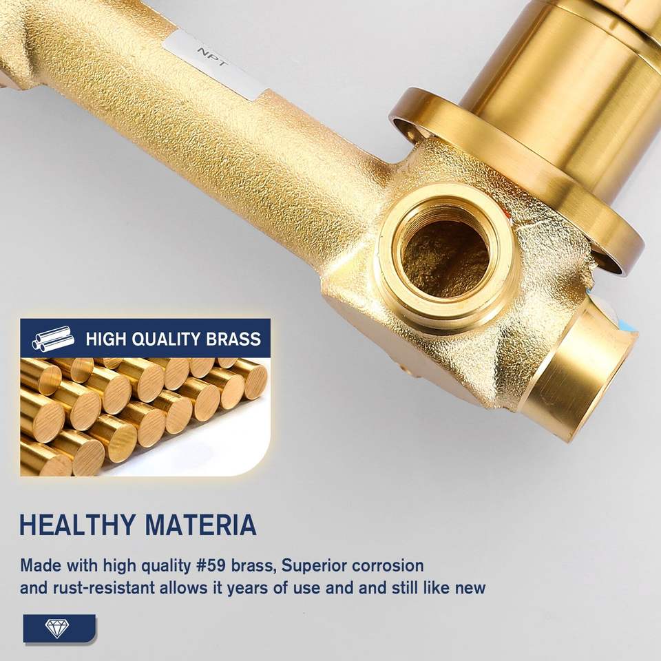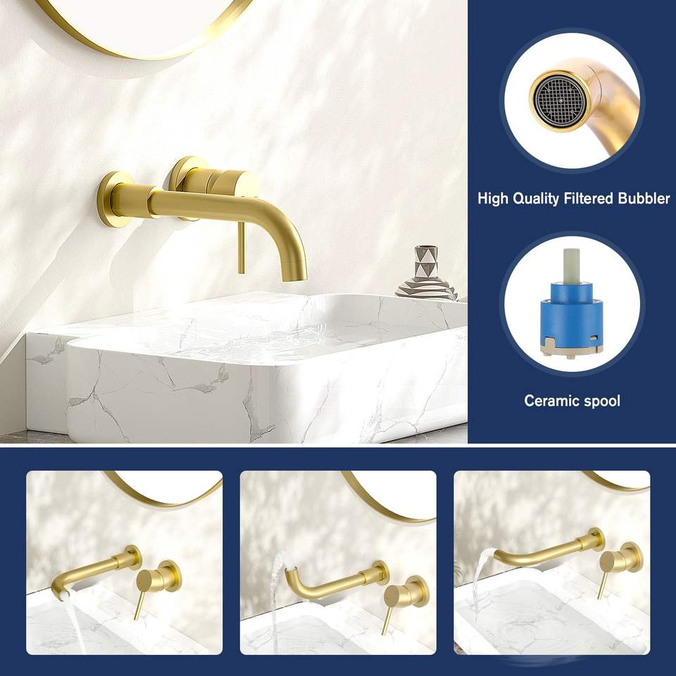 Single-Handle Wall Mount Faucet for Bathroom Sink or Bathtub 2-Hole Brass Rough-in Valve Brushed Gold-Basin Faucets