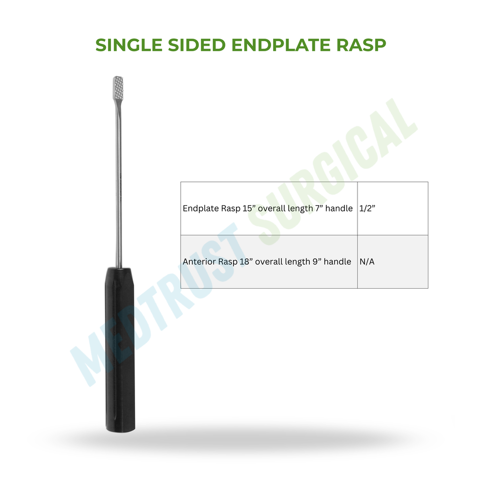Disponible en longueurs totales de 15 et 18 pouces, avec une surface de râpe de précision simple face, un manche ergonomique, une construction en acier inoxydable de qualité chirurgicale et conçu pour les procédures de fusion intervertébrale de la colonne vertébrale.