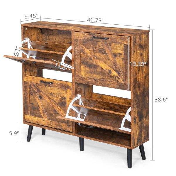 Porte-chaussures à poignée simple avec 4 tiroirs rabattables en métal noir et bois massif sur un design de porte de grange en plastique noir