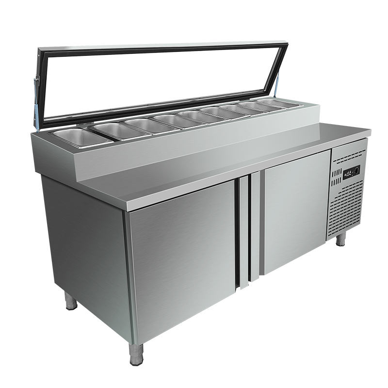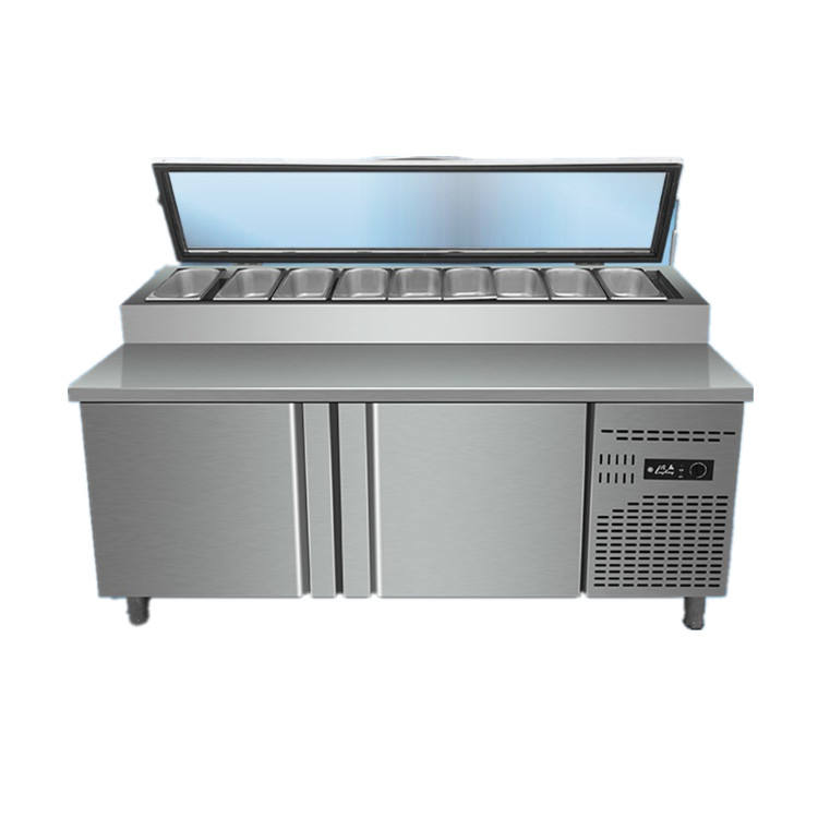Comptoir de préparation de pizzas et de salades à température unique, table de présentation en acier inoxydable, réfrigérateur à deux portes, équipement de réfrigération sans givre