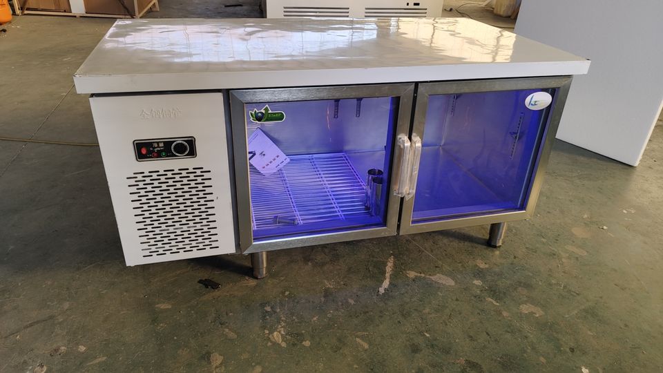 Établi de réfrigérateur en acier inoxydable à température unique avec éclairage LED Refroidisseur de réfrigérateur à 2 portes en verre