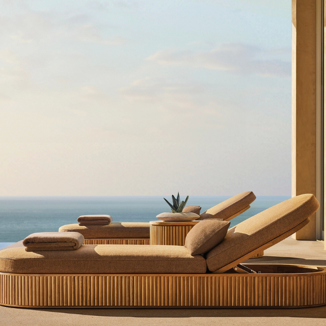 Single sun lounger made of teak wood with a modern style for outdoor use, equipped with soft foam for resting