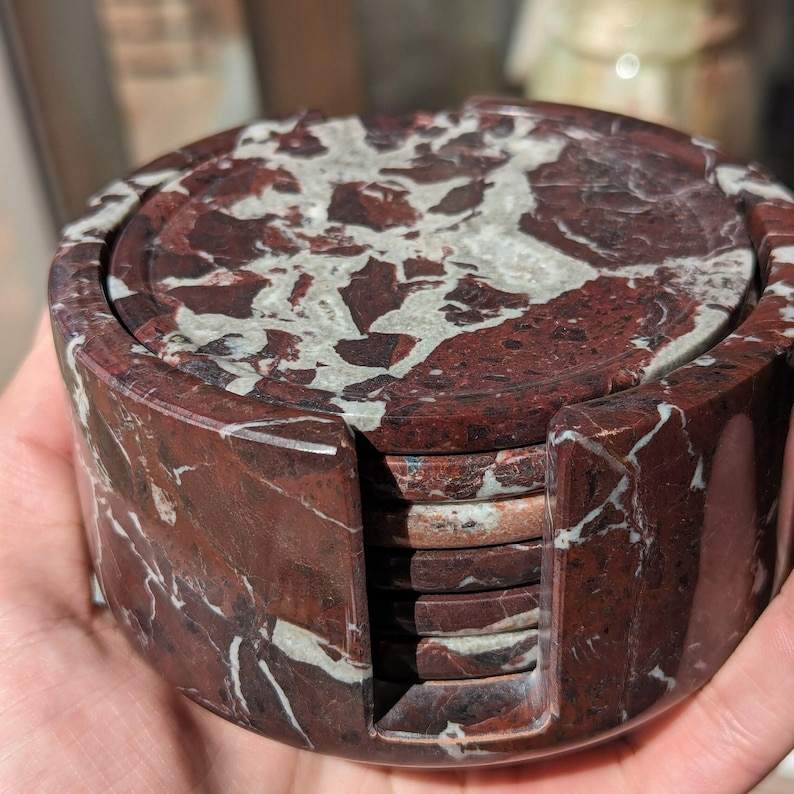Six-Piece Red Onyx Coasters Carved Stone Drink Coaster Set Elegant Home & Coffee Table Accessories