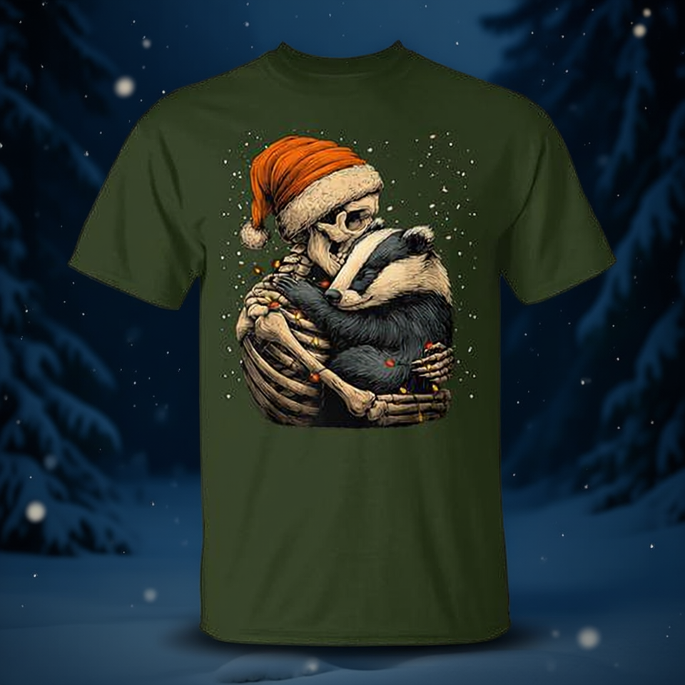 T-shirt de Noël gothique avec squelette câlinant un blaireau et un chapeau de Père Noël