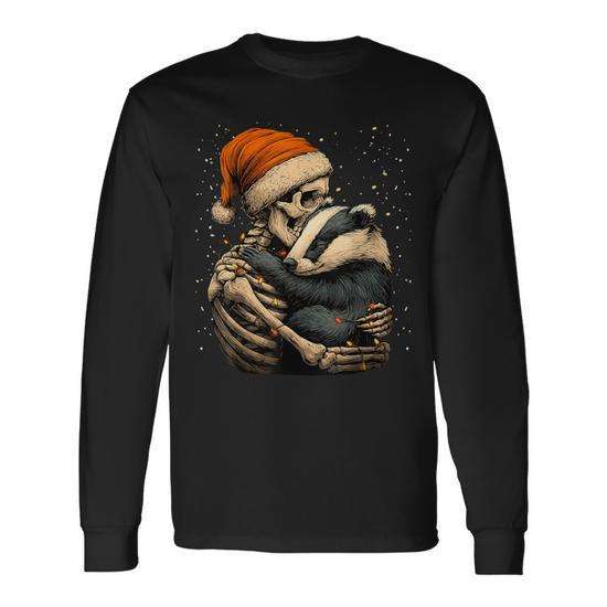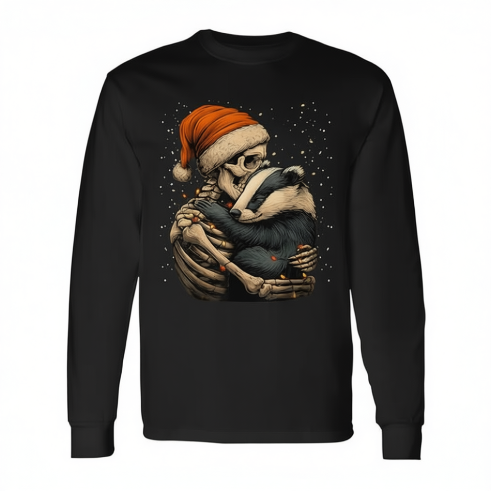 T-shirt promotionnel unisexe à manches longues et col rond pour adulte, motif squelette câlinant un blaireau avec chapeau de Père Noël, thème Noël gothique neigeux