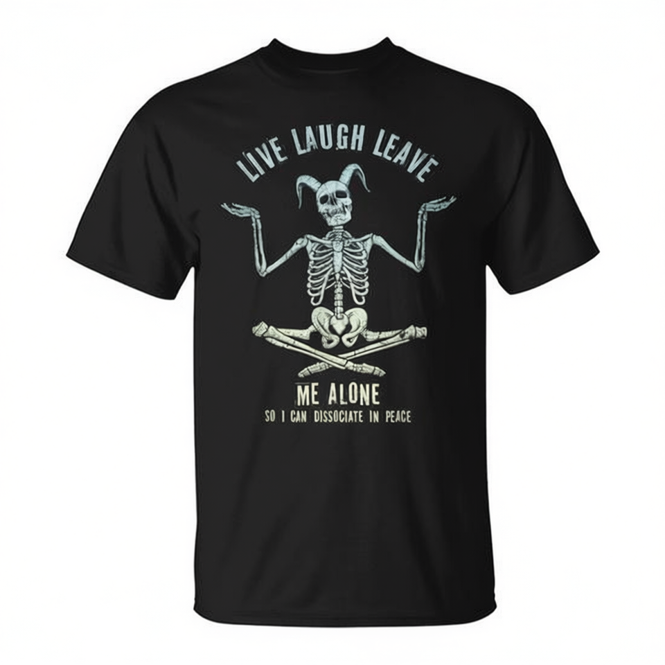 T-shirt unisexe à col rond et manches courtes pour adulte, sérigraphié, avec le slogan « Skeleton Live Laugh Leave Me Alone Dissociate In Peace »