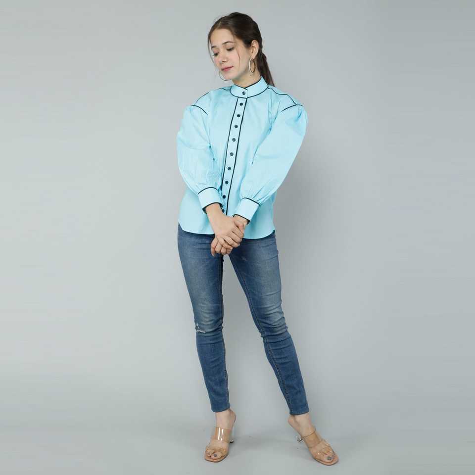 Bleu ciel formel dames haut brodé Logo taille libre minceur mousseline de soie et popeline longue longueur pour la saison automne et printemps