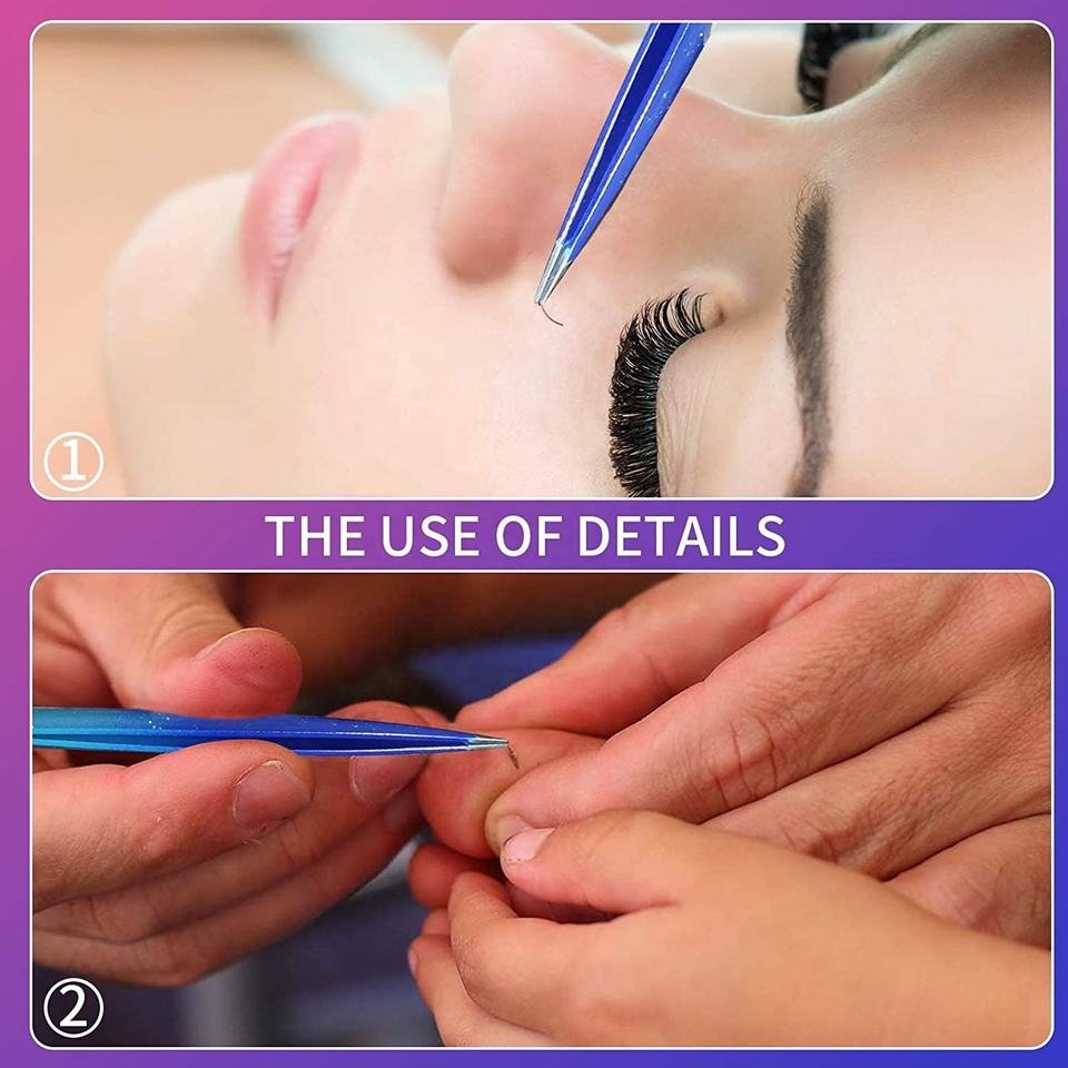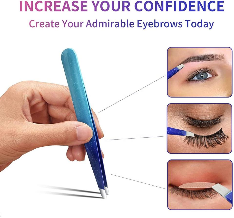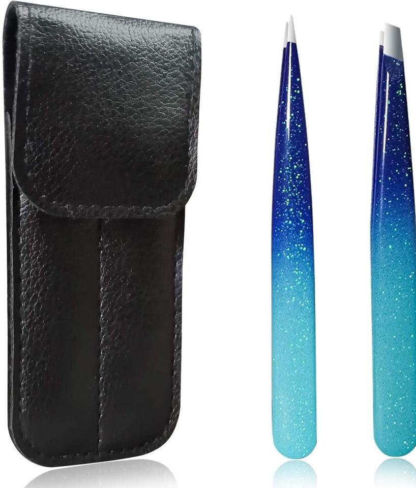 Pince à sourcils à pointe inclinée en acier inoxydable dégradé bleu ciel ensemble utilisation de précision avec pochette en cuir PU