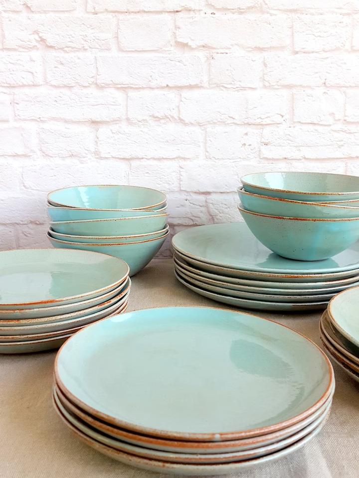 Assiette à dîner en céramique bleu ciel au charme rustique, bord brun, finition brillante, construction robuste, idéale pour une ambiance chaleureuse à la table de ferme.