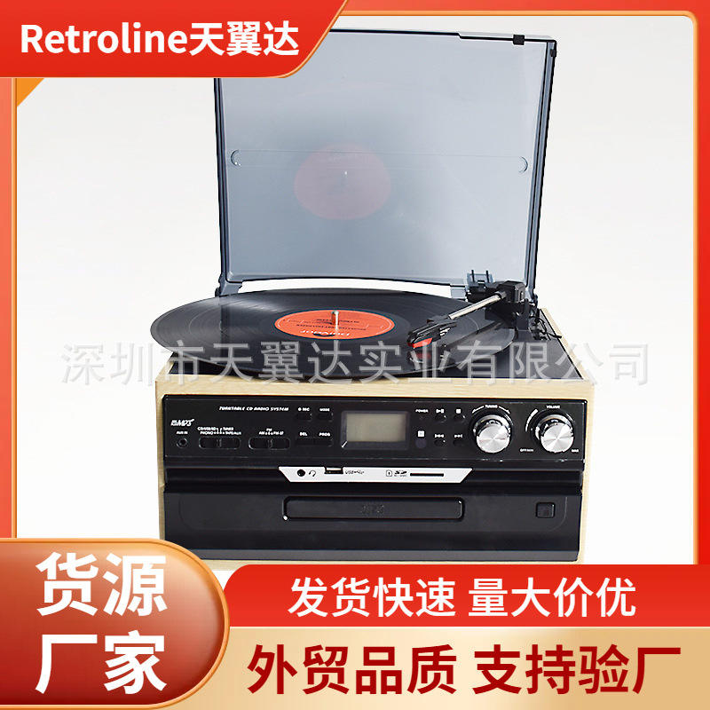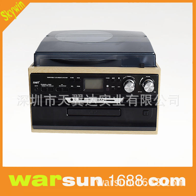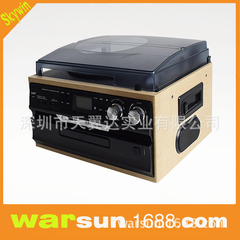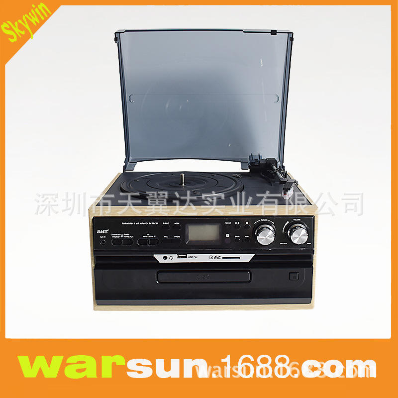 Tourne-disque en bois massif Skywin avec lecteur USB, enregistreur de cassettes, trois vitesses et radio FM