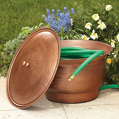 Baril de rangement pour tuyau d'arrosage en métal gaufré bleu ardoise avec couvercle, élégant organisateur de tuyaux d'eau pour patio