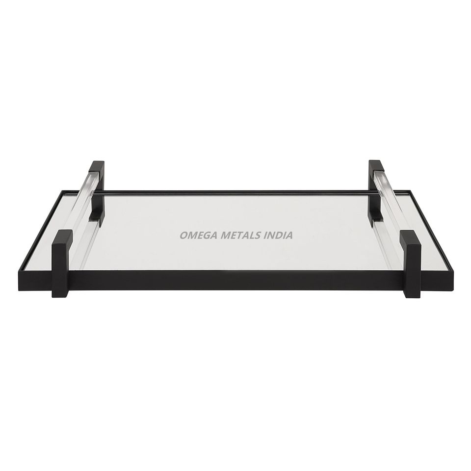 Plateau de service rectangulaire noir élégant avec dessus en verre transparent et poignées robustes idéal pour un décor moderne et un divertissement élégant