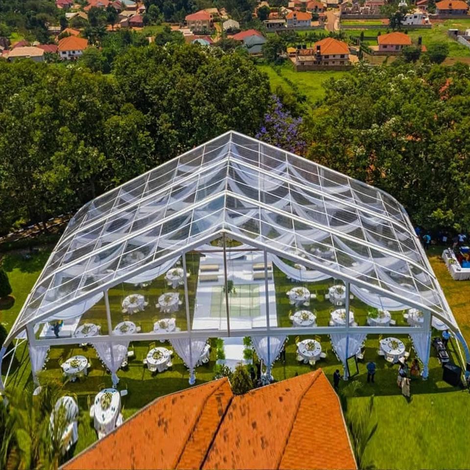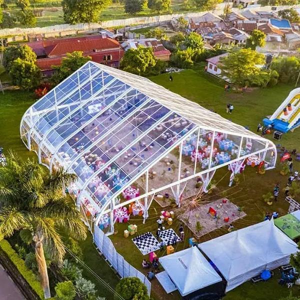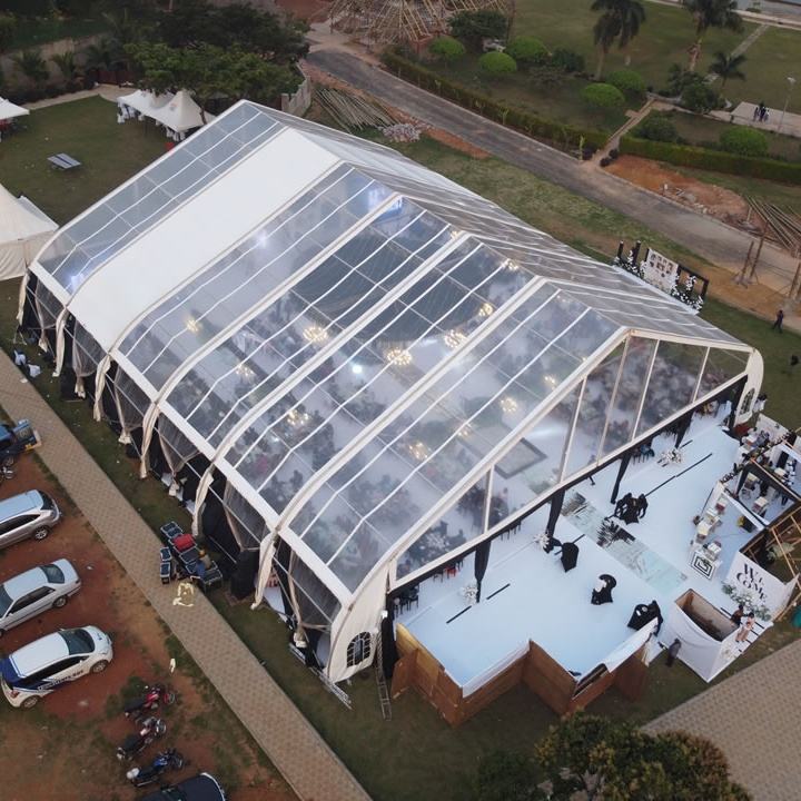 Tente de réception haut de gamme quatre saisons en PVC avec cadre en aluminium incurvé au design élégant pour événements
