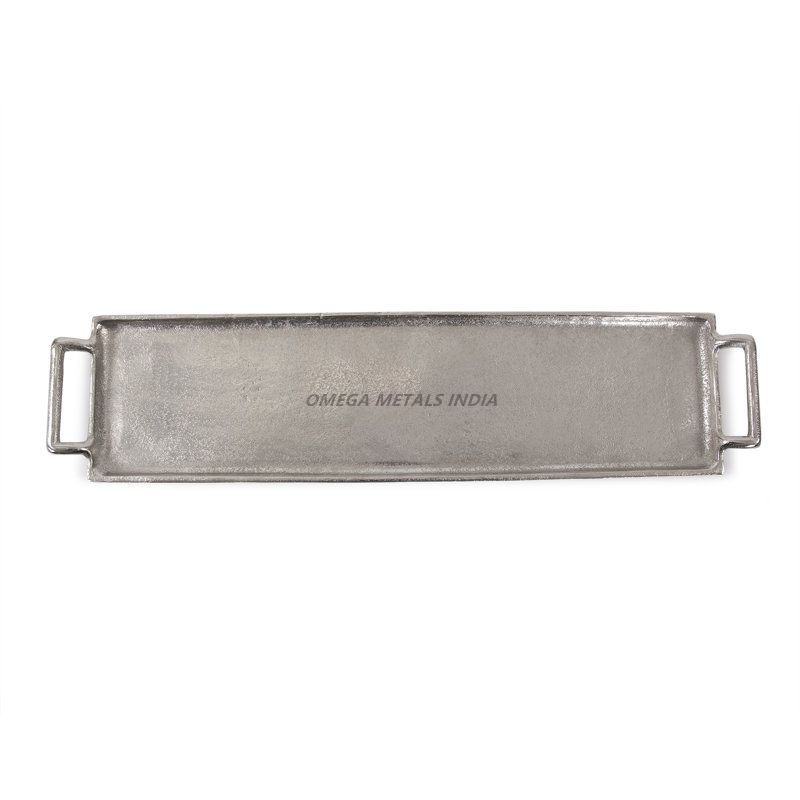 Plateau de service rectangulaire décoratif en argent avec poignées robustes, idéal pour les réceptions et une décoration intérieure élégante
