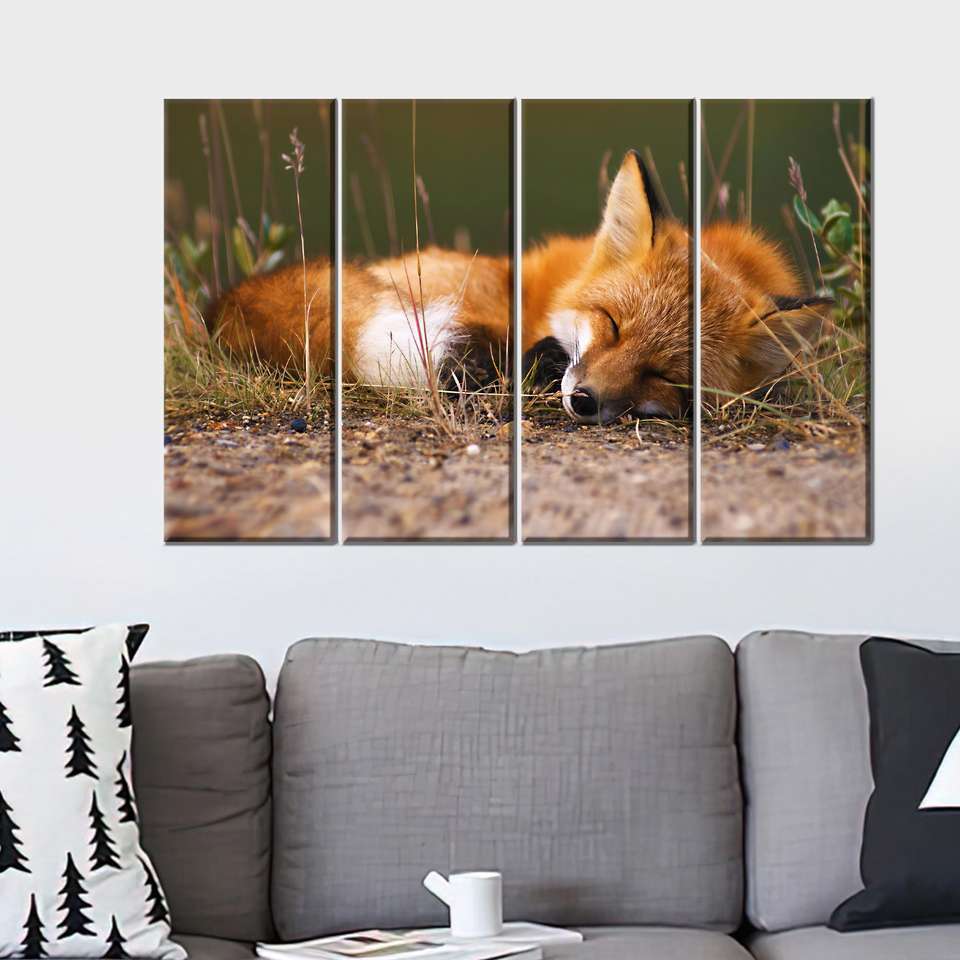 Impression sur toile 3D Sleeping Fox - Grande œuvre d'art décorative pour la maison sur le thème des animaux, 4P : encadrée