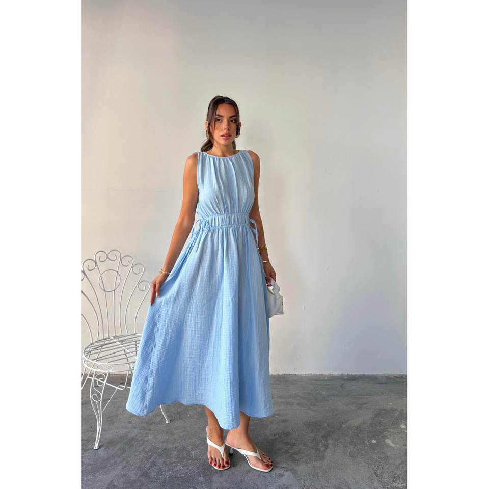 Robe longue bleue sans manches avec taille élastique, en mousseline, longueur genou, idéale pour les occasions spéciales, les invités d'église et les mariages