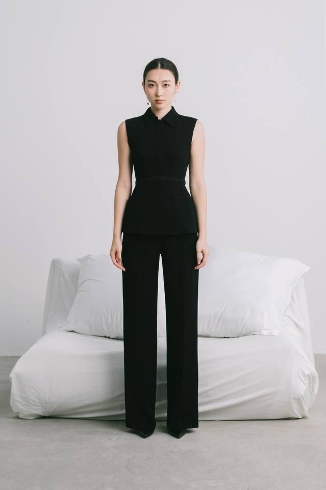 Veste sans manches en tissu triacétate boutons cachés ceinture élégante FRANI veste courte vestes pour femmes avec jupe midi de WHITEANT