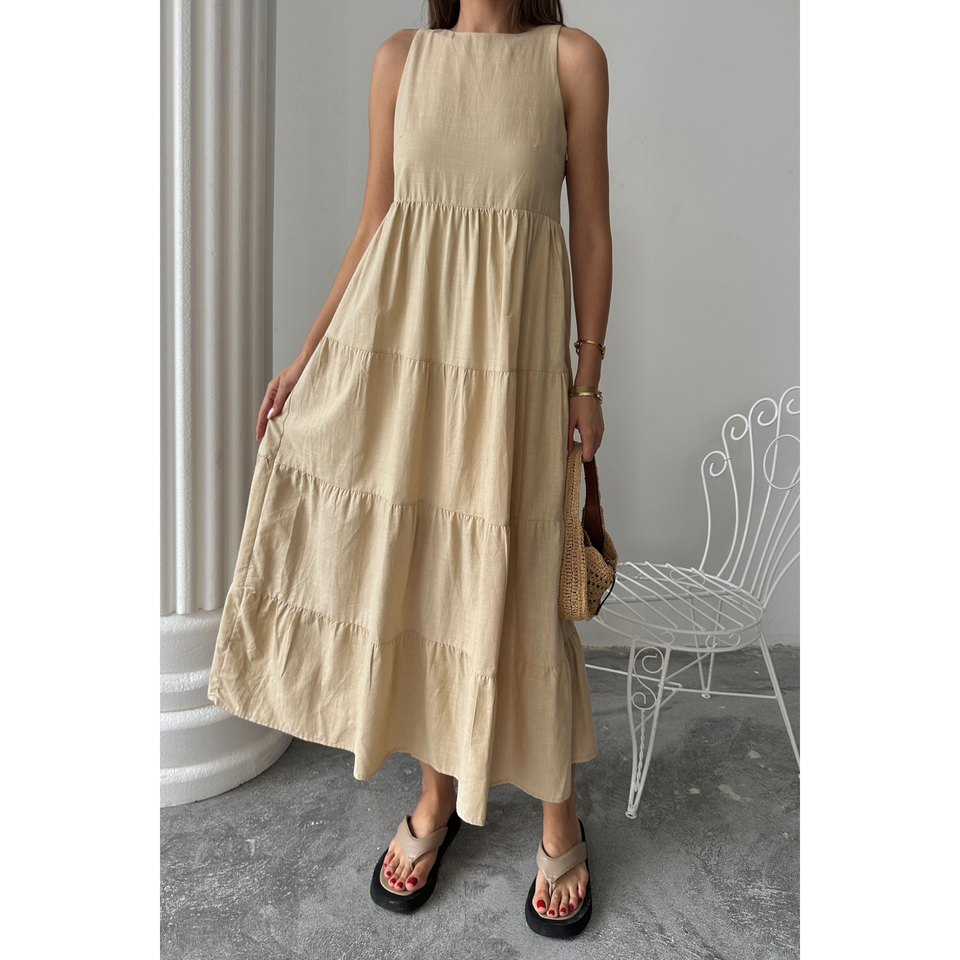 Sleeveless Long Linen Dress Beige Tiered Maxi Casual Summer Dress Women's S