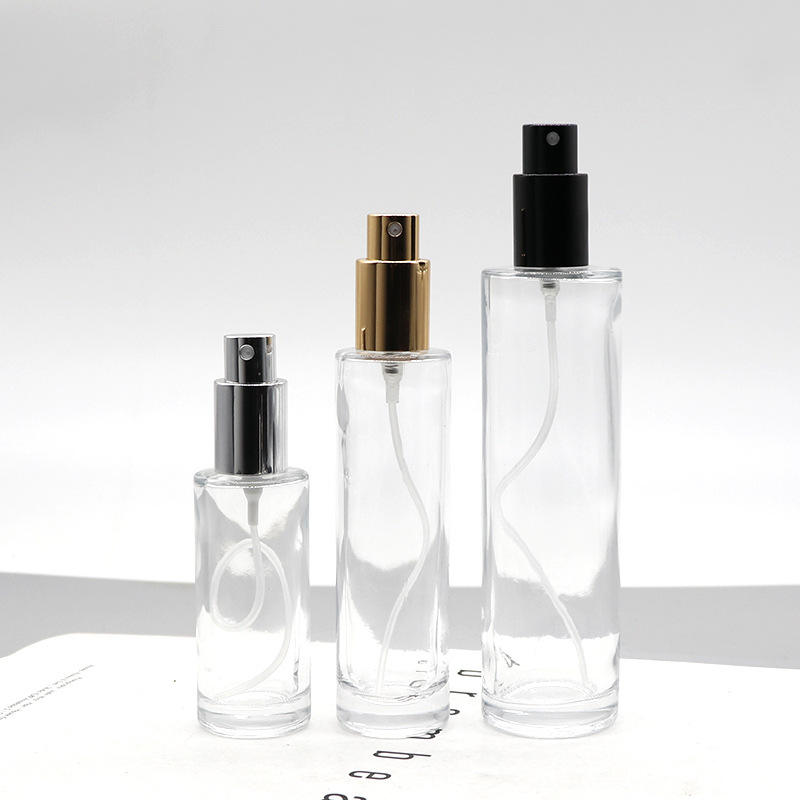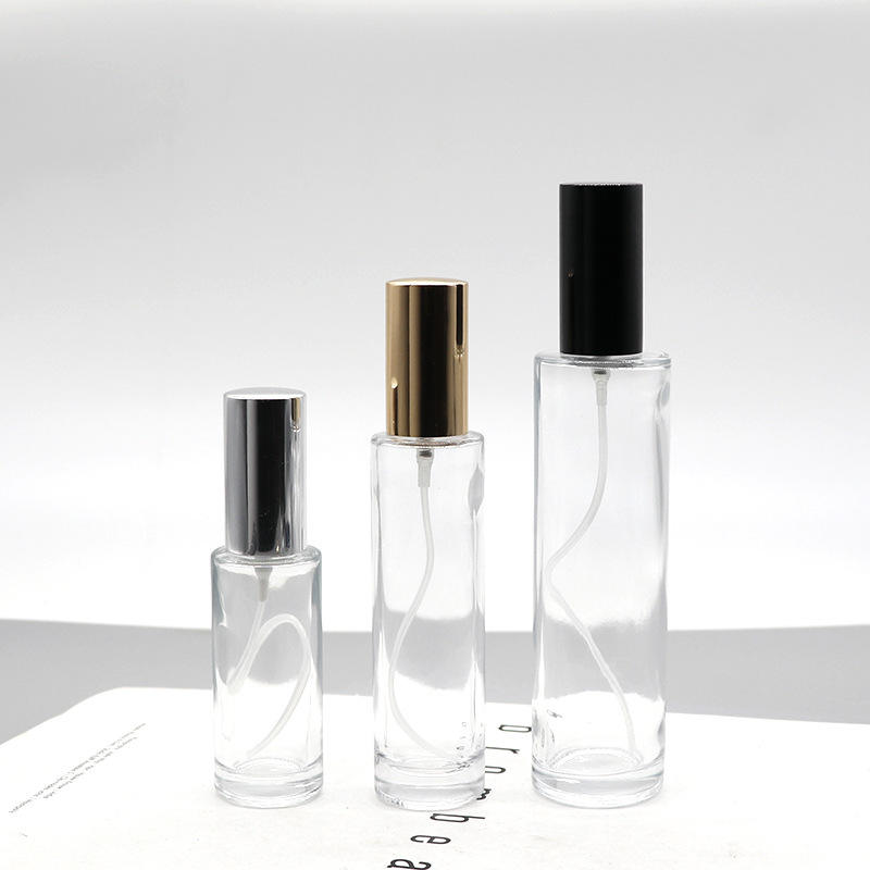 Flacons en verre cylindriques fins de 30 ml, fond épais, flacon de parfum avec pompe pulvérisatrice dorée/argentée