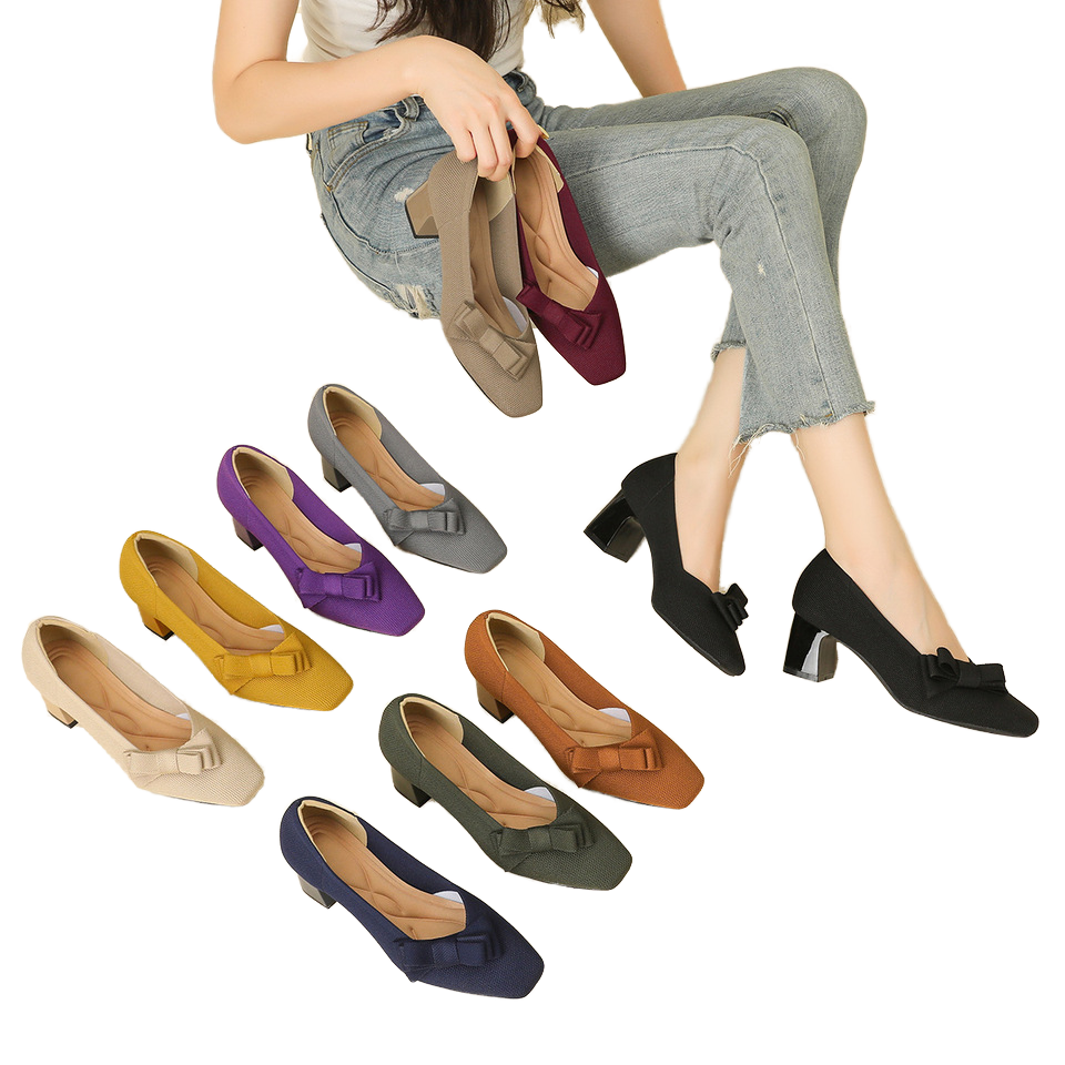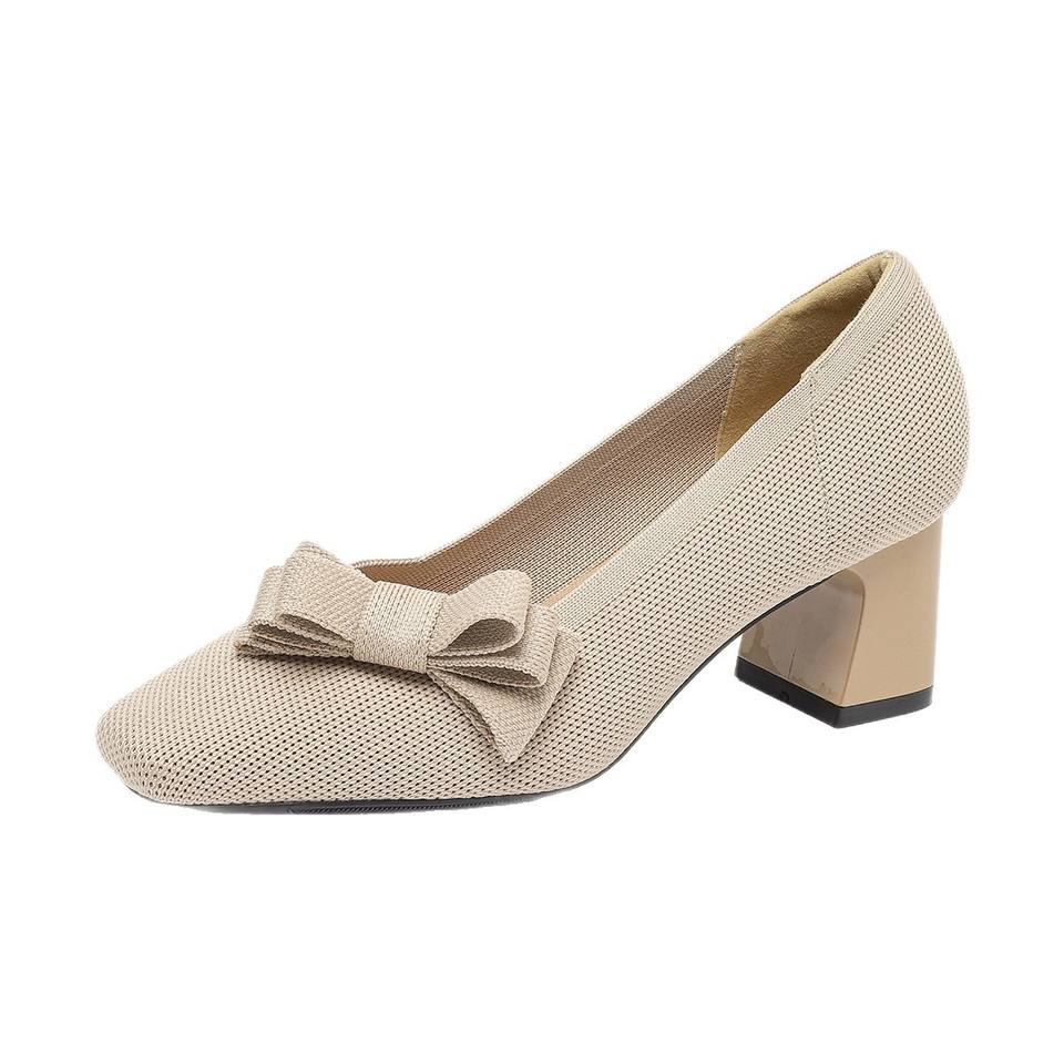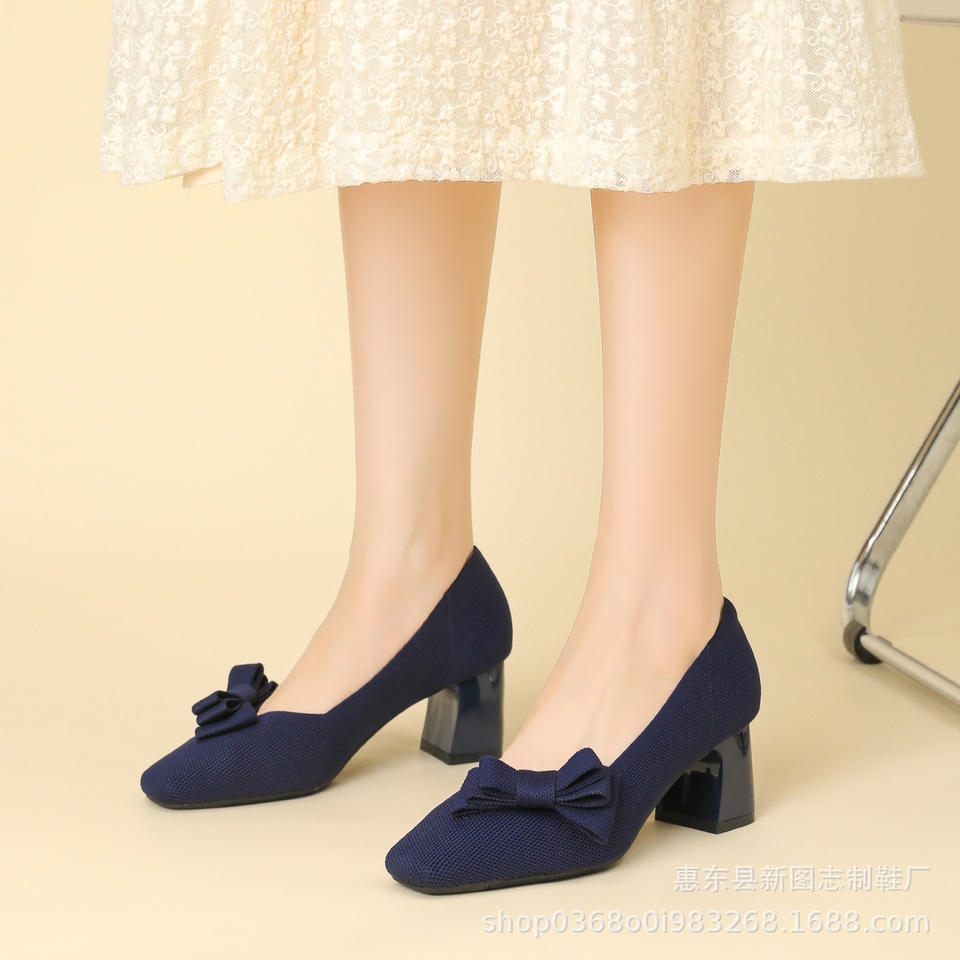 Chaussures à enfiler d'été respirantes à bout carré et talon épais pour femme, style princesse avec nœud, en maille