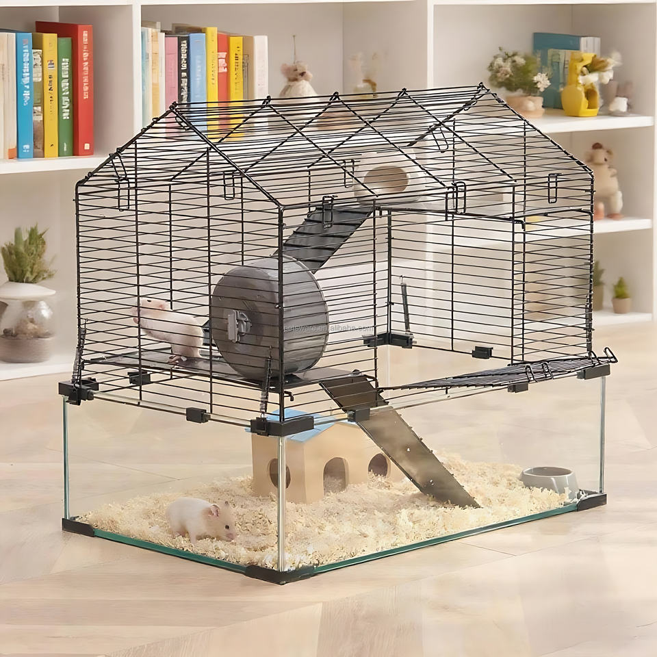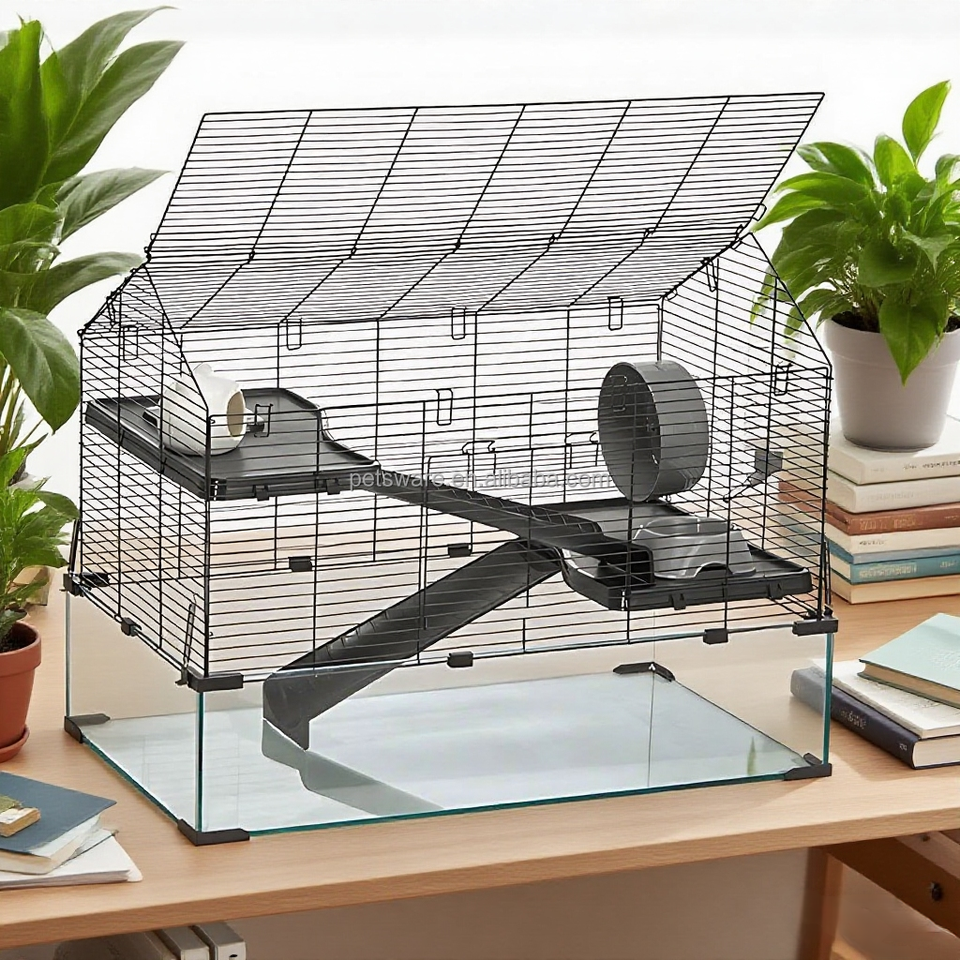 Cage à fil métallique anti-mastication pour petits animaux avec fond de réservoir en verre respirant pour gerbilles et rongeurs