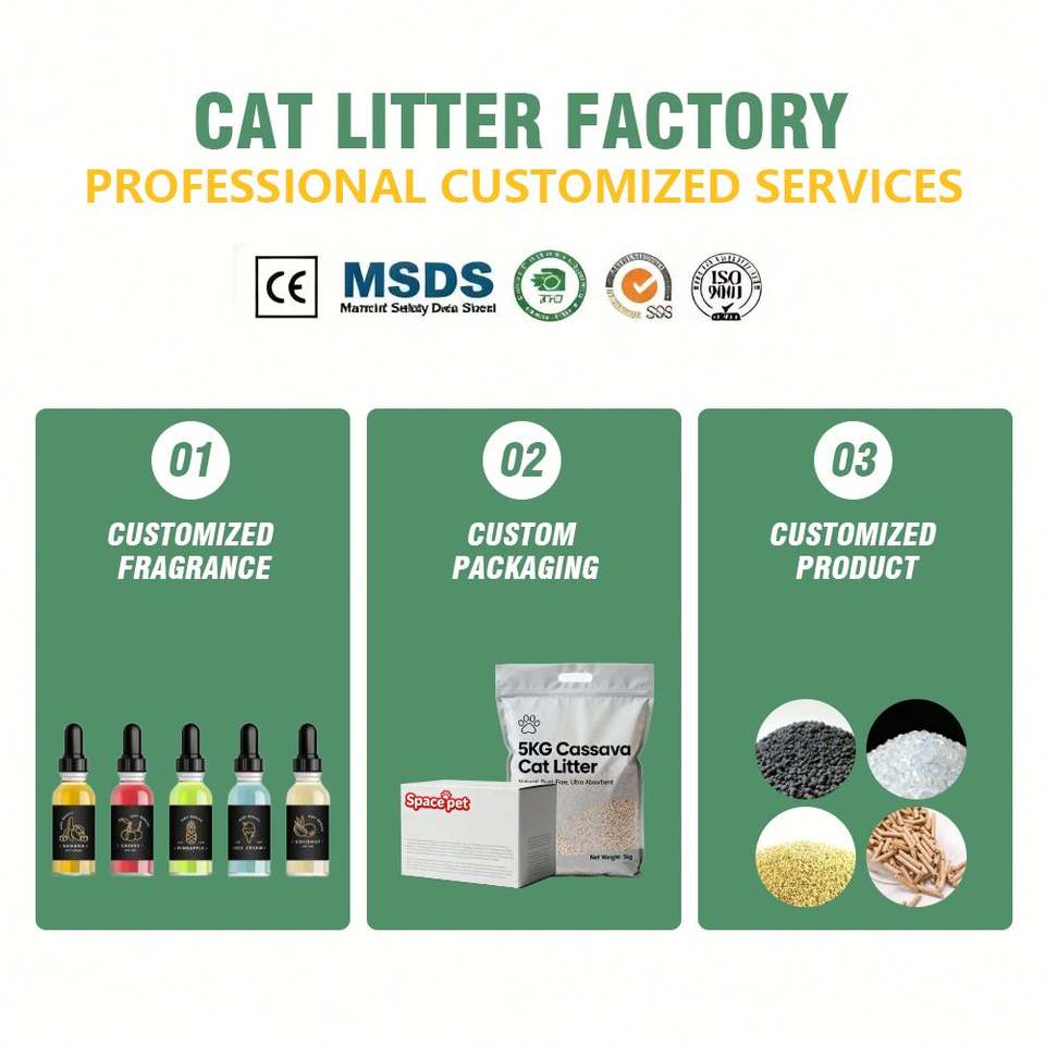 Biodégradable, Écologique, Sans poussière, agglomération rapide, hautement adsorbant, Flushable, contrôle des odeurs, Contrôle supplémentaire d'odeur, 99% sans poussièreDispositif