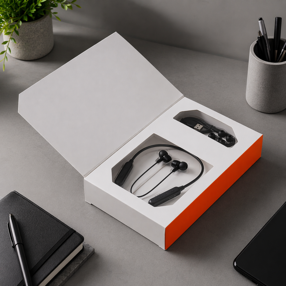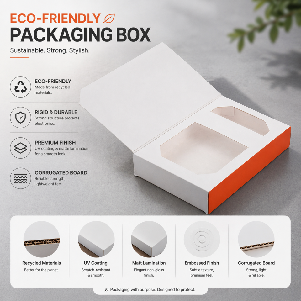 Boîte d'emballage rigide pour électronique en carton recyclé écologique, avec revêtement UV, laminage mat et carton ondulé gaufré