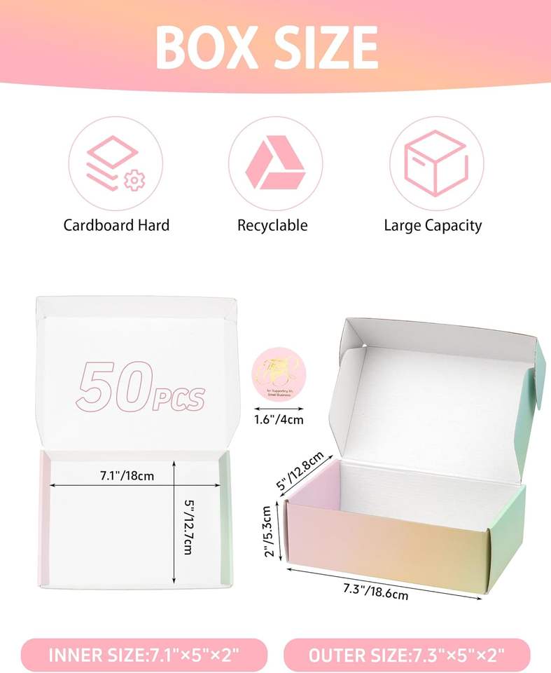 Petites boîtes d'expédition colorées, 7x5x2 pouces, boîte d'emballage mignonne pour cadeau, lot de 50