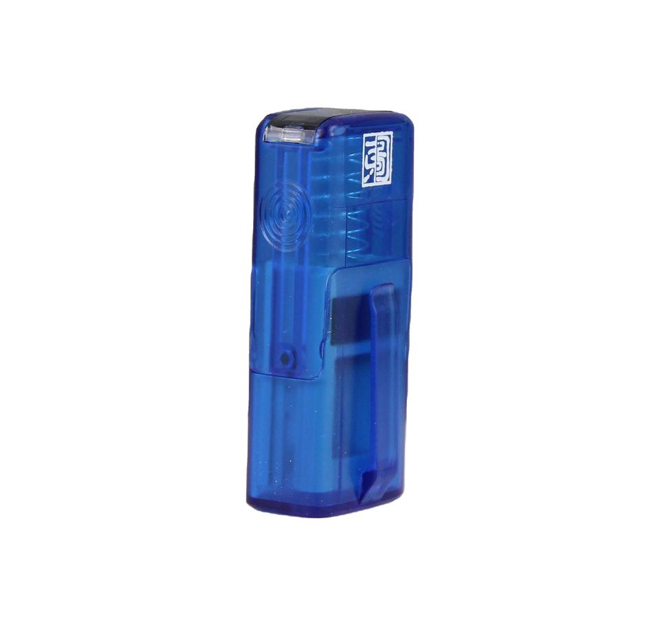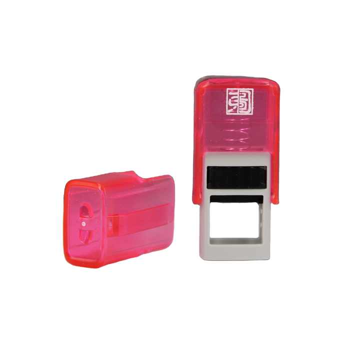 Petit tampon auto-encreur à rabat plat avec nom et motif oriental pour usage de bureau.