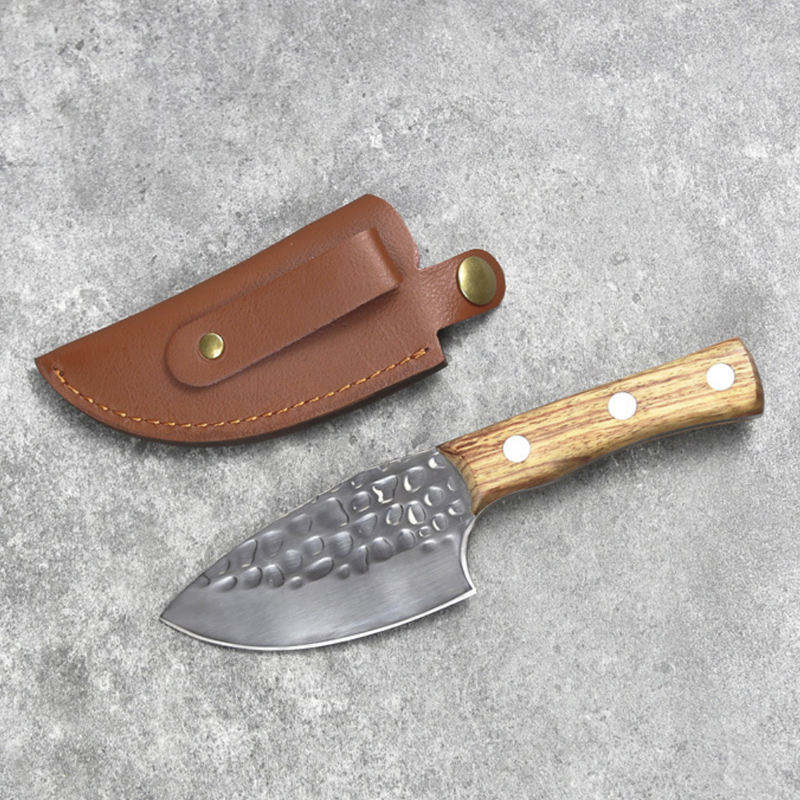 Petit couteau artisanal forgé pour le camping, la chasse, la viande, le poisson, le style caveman, en acier Damas, lame pleine longueur, étui en cuir, personnalisable OEM